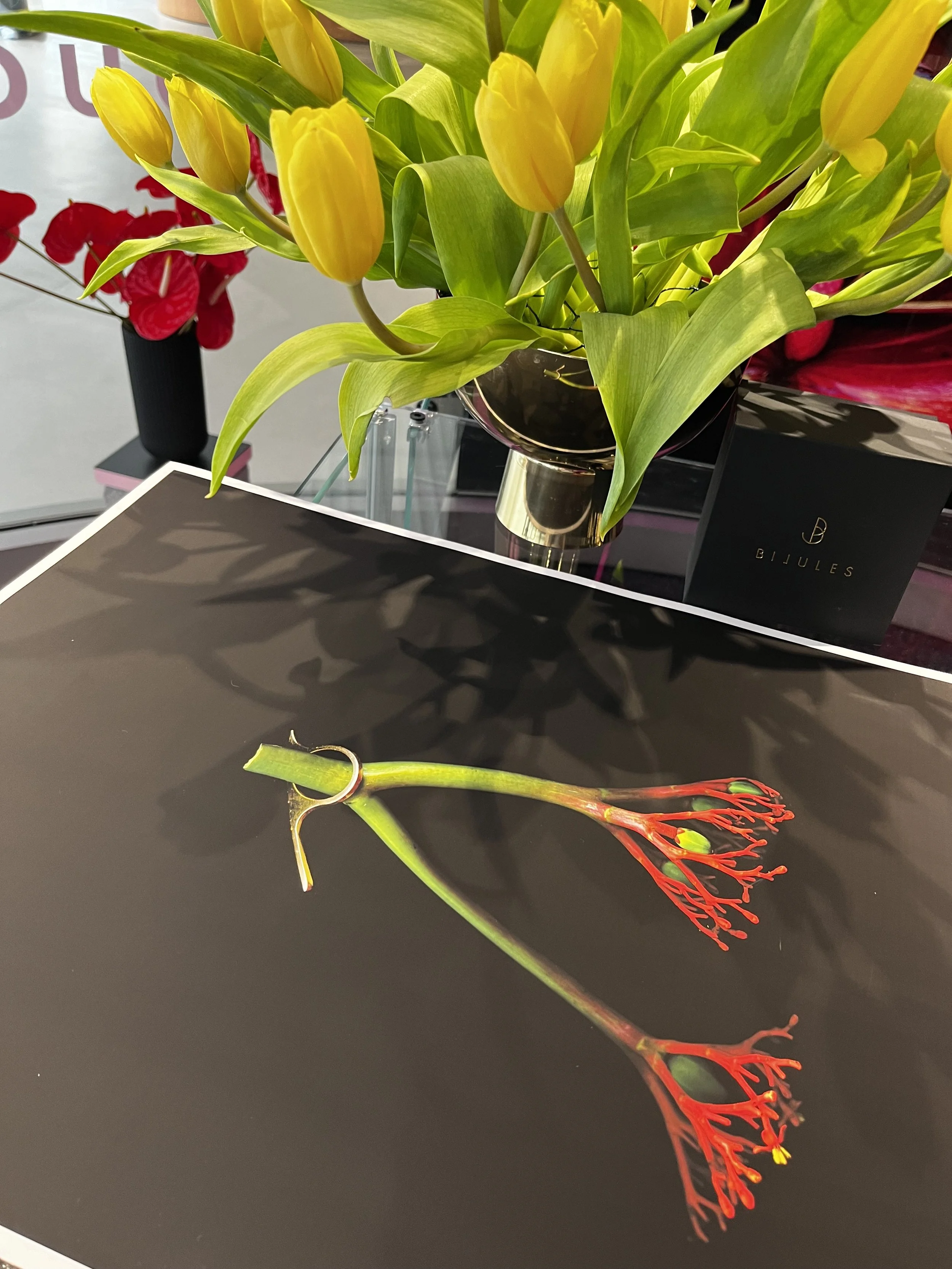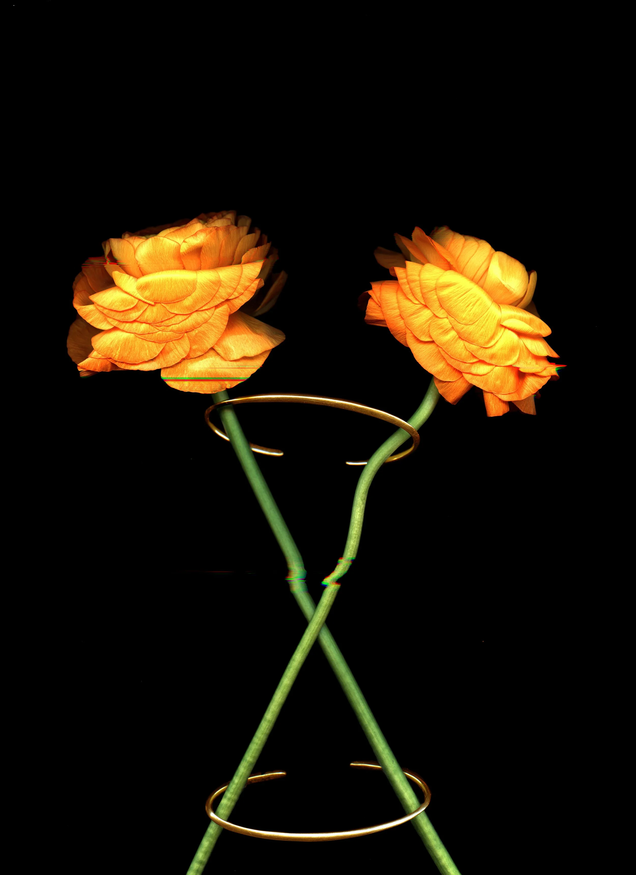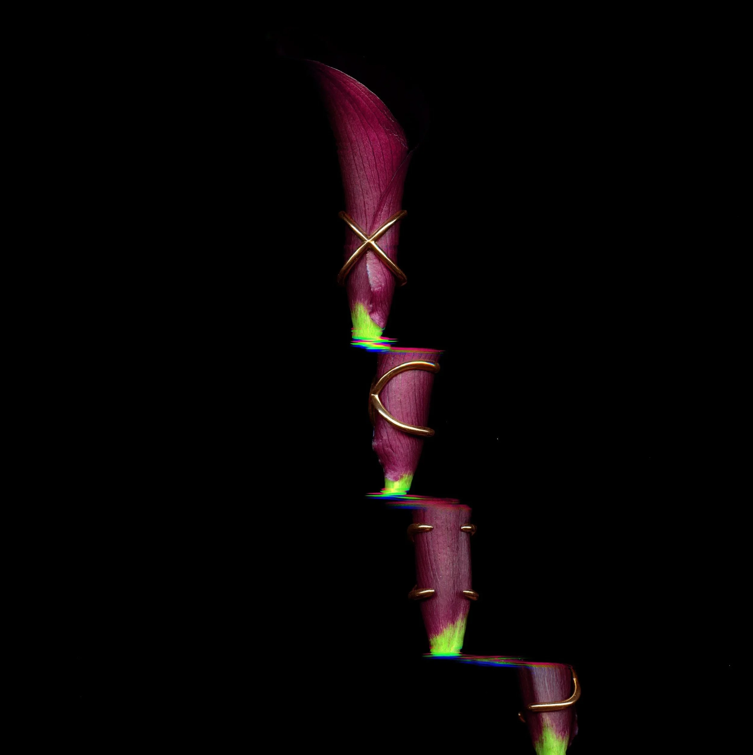 Glitch Flora examines the symbiosis between the heavy and permanent nature of gold, crafted and refined by the human hand; and the fleeting yet vivid life of a flower.  Every image was created using one flower, one piece of Bijules jewelry, and a flatbed scanner.  Each was captured in one take using no digital compositing.  Living in the age of artificial intelligence, we wanted to create imagery using an analog method as both a commentary and a form of resistance to the automation of the creative process.  To also serve as a powerful reminder of the resourcefulness and boundless creativity of the human mind.